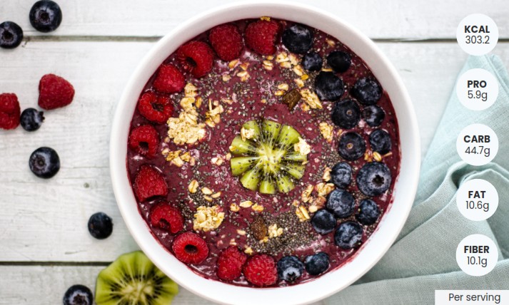 To a blender add the frozen berries, acai, banana and almond milk. Blend until