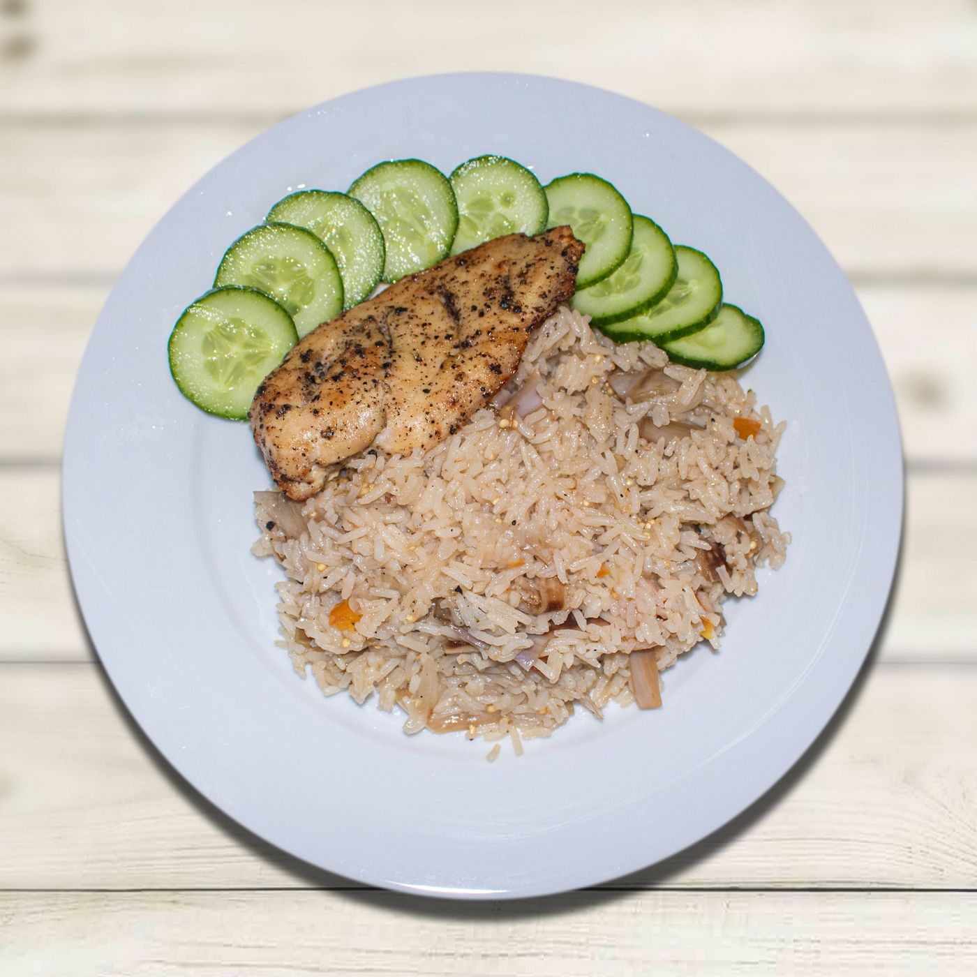 AIR-FRIED CHICKEN AND GREEK EGGPLANT AND RICE
