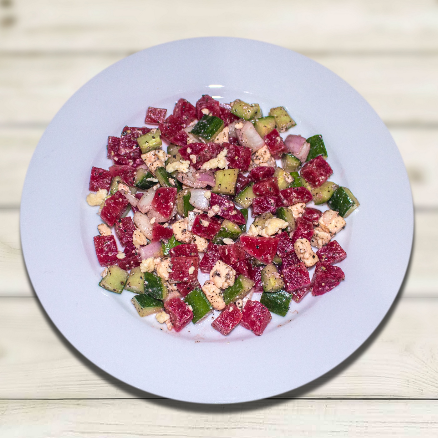 - Combine beetroot, cucumber, onion, feta cheese, and parsley with the lemon vinaigrette and serve.