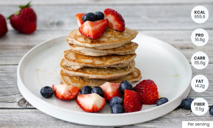 Plate your pancakes, and drizzle with maple syrup and garnish with an array of