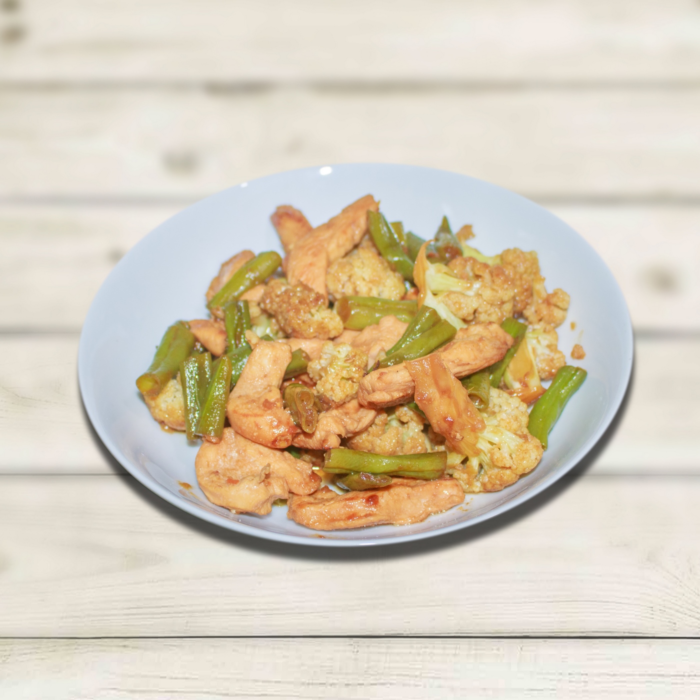 CHICKEN GINGER CAULIFLOWER AND BEANS STIR-FRY
