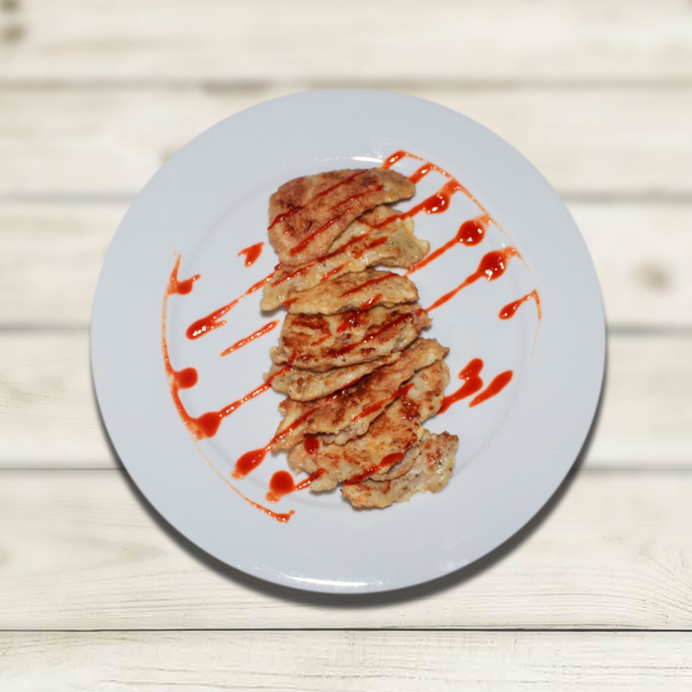 - In a saucepan, heat olive oil over medium heat. Fry chicken in batches, about 4 minutes on each side, until each piece turns brown. Remove from the pan and serve on a plate.