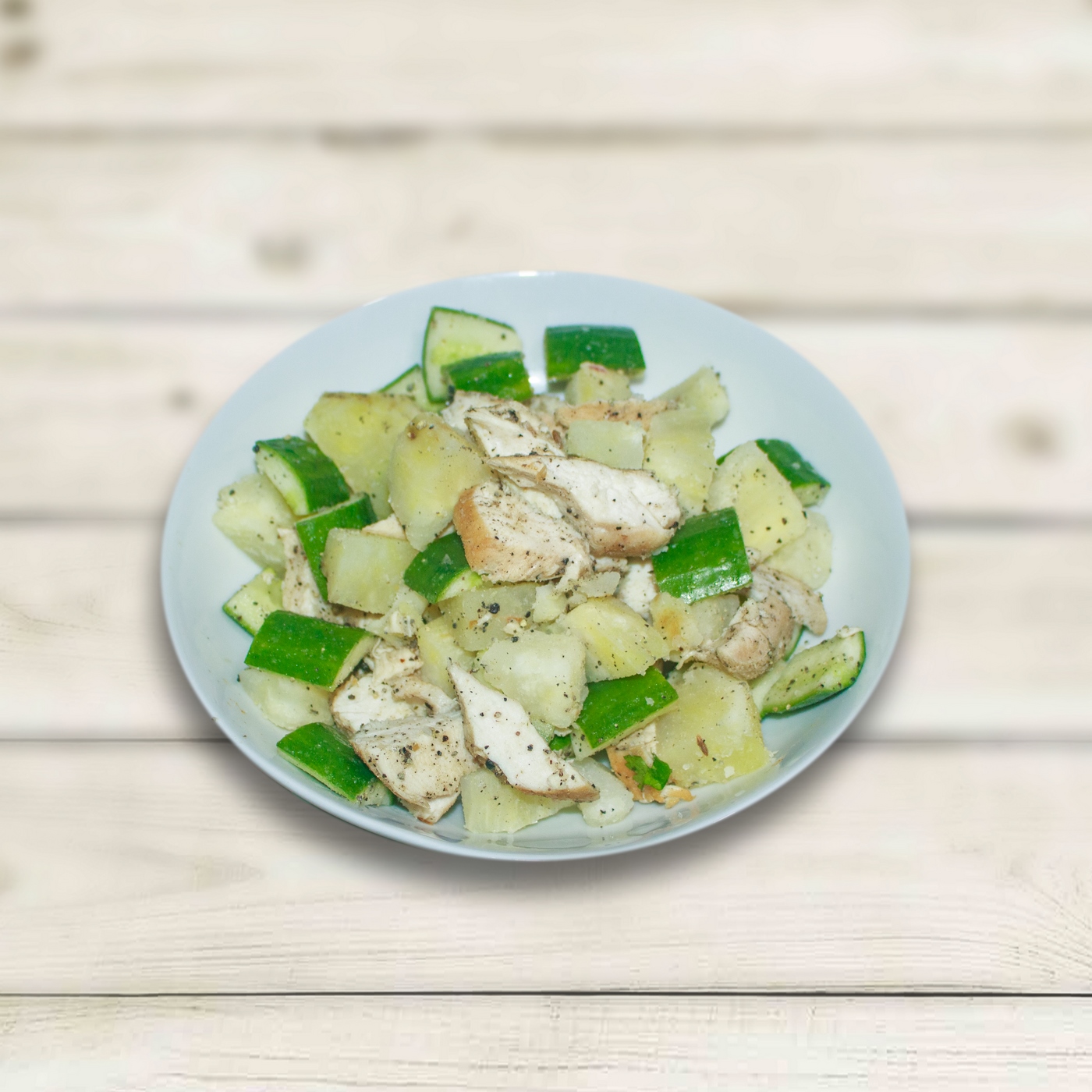 - Toss all sweet potato, boiled chicken, and cucumber with vinaigrette and sugar free syrup.