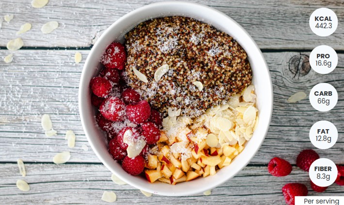Divide the cooked cinnamon quinoa between two bowls. Top with the toasted