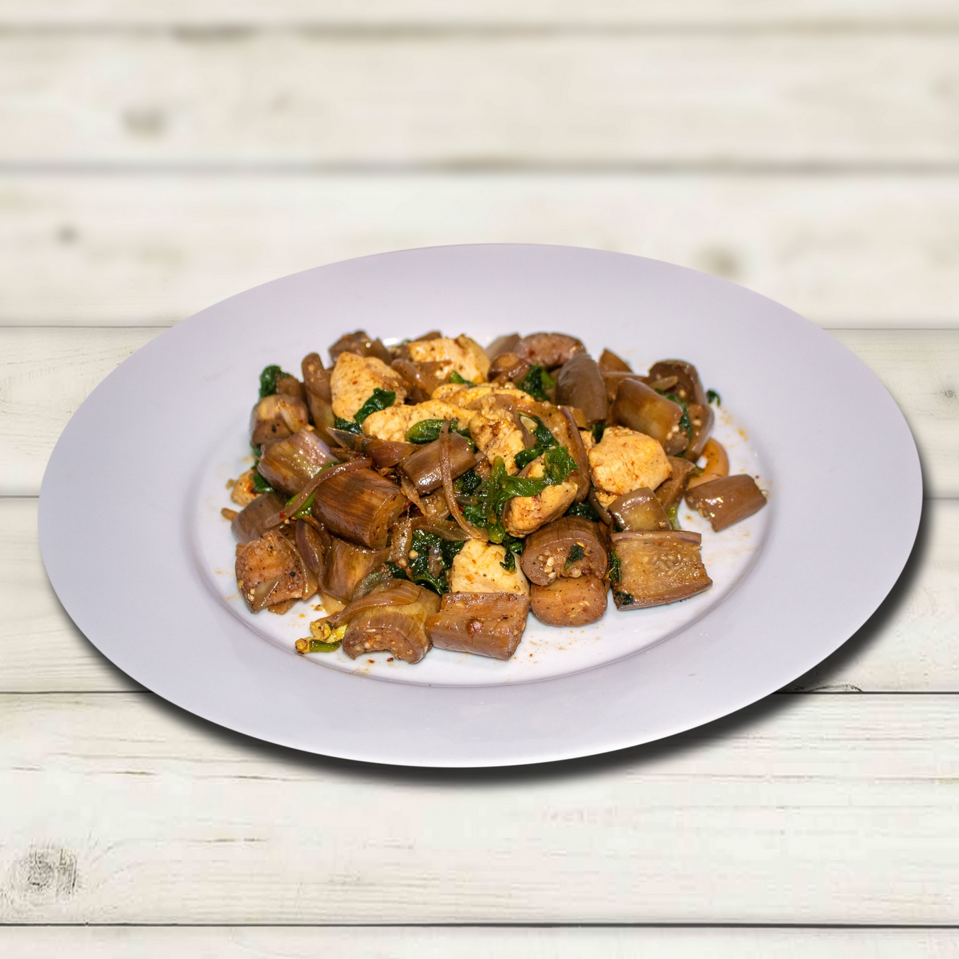 Heat oil in a large sauté pan over medium heat. Add garlic, onion and eggplant and let cook for 5 minutes, stirring often until onions are translucent and eggplant is beginning to soften.