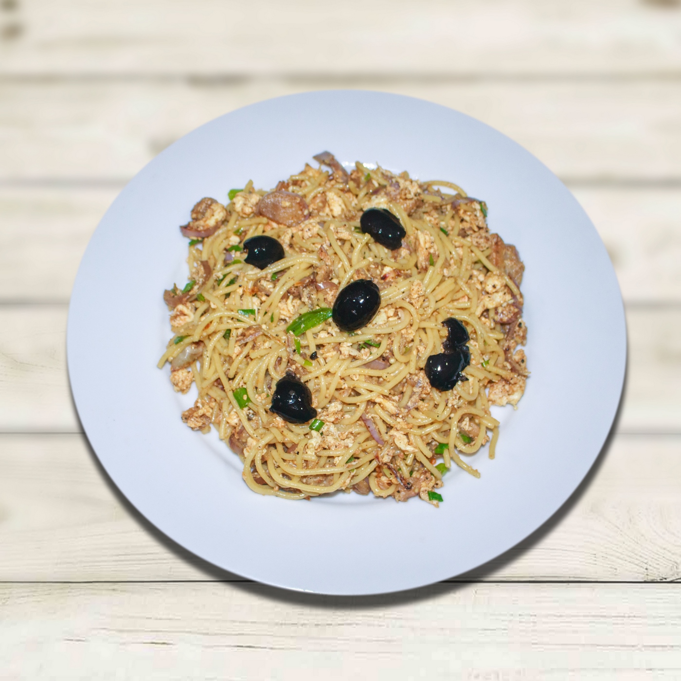 - To serve, top the egg mix on the spaghetti in a bowl, and place the eggplant slices on top and garnish with olives.