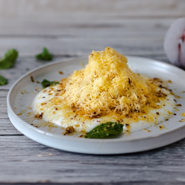 Using a grater, grate the frozen peach directly over the yogurt, ensuring even