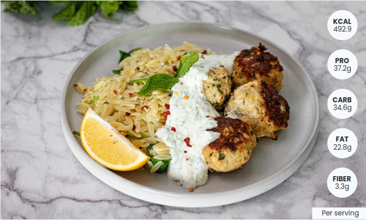 Plate the orzo and top with the cooked meatballs. Spoon the tzatziki sauce over the