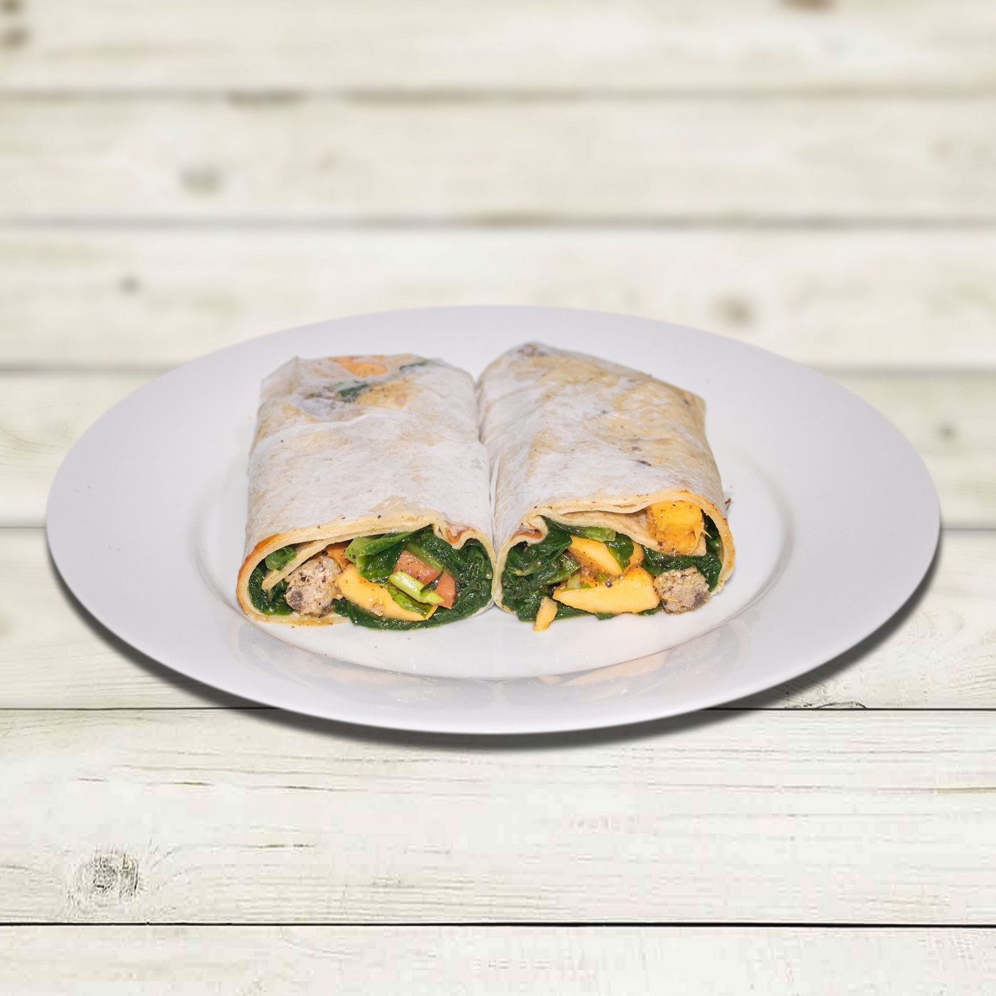 - To serve, place the wrap, on a flat work surface. Top with the spinach mixture and flaked fish. Roll up tortilla and cut each in half.
