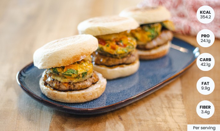 cheese. Layer with one square of egg, followed by a sausage patty. Brush both