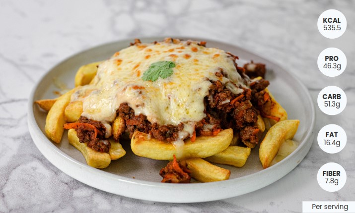 Place the crispy fries in two heatproof dishes. Spoon the Bolognese sauce over the