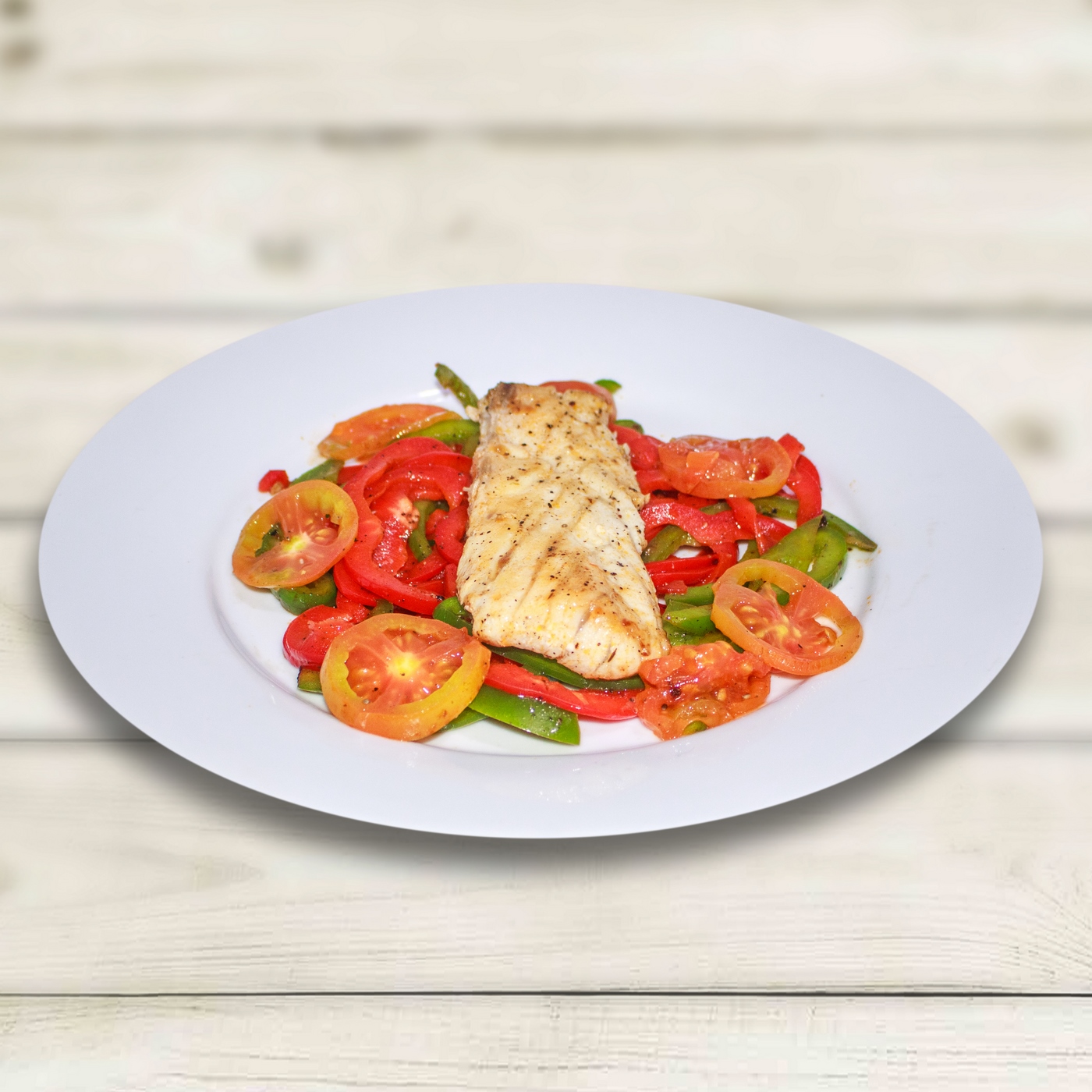Centre piece of fish on an individual piece of aluminium foil (large enough to enclose the fish when folded). Sprinkle the fish with salt and pepper. Divide the sliced tomatoes, onion, and red and yellow peppers between fish, and place on top of the fillets. Sprinkle evenly with the capers and parsley. Drizzle each fillet with 1 teaspoon of olive oil and 1 teaspoon of lemon juice.