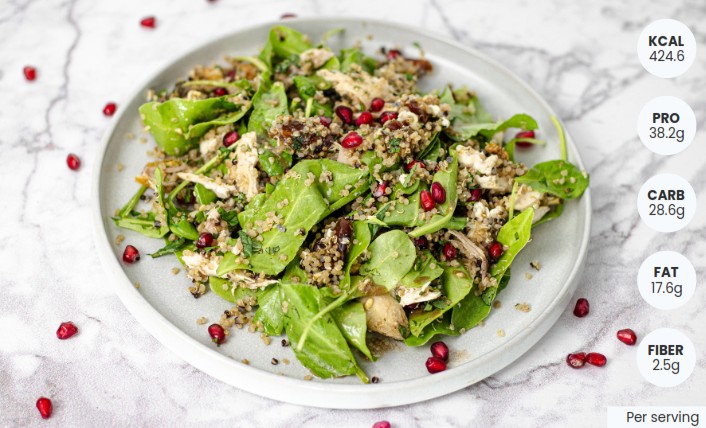 In a large bowl, combine baby spinach, quinoa, shredded chicken, pomegranate