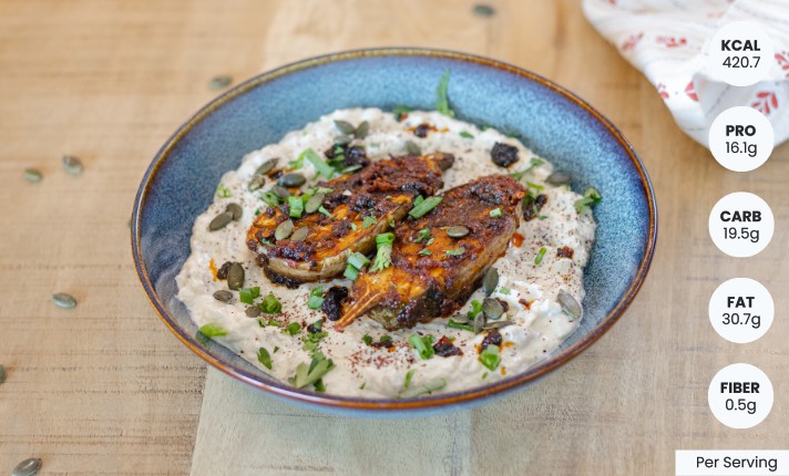 aubergine. Finish with sliced spring onion, toasted pumpkin seeds, fresh parsley, and a