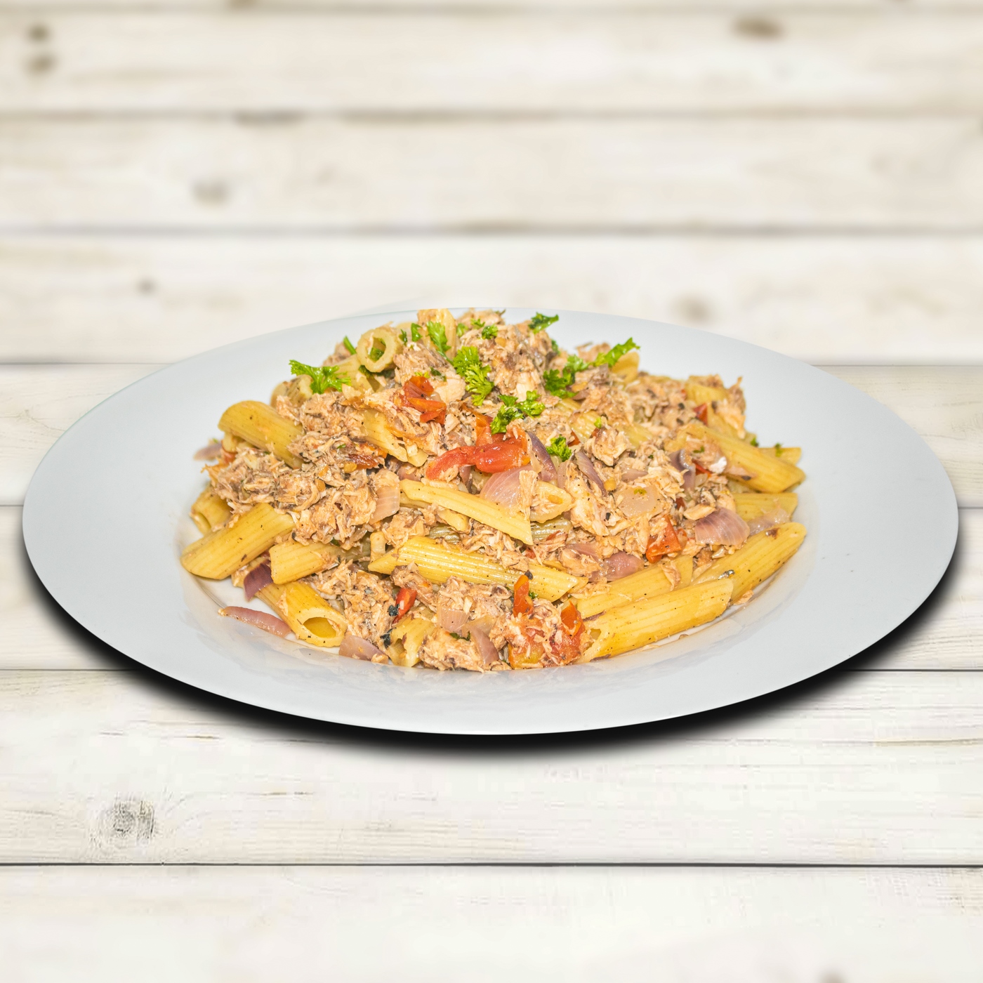 - Heat oil over medium high heat. Add garlic and cook until fragrant. Add the onion and cook until softened, then add the canned tomatoes and 1/2 cup water. Simmer 3 minutes, then add the tuna.