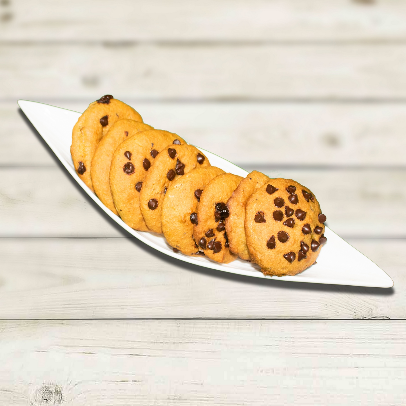 - Scoop 1/8 cup (or 2 tablespoons) of dough onto baking sheet per cookie. Dough is very sticky – it helps to dampen your fingers and use them to flatten them out slightly, as they don’t spread much. Press 4-5 chocolate chips into each cookie before baking, and bake for 10-15 minutes, or until set. Enjoy!