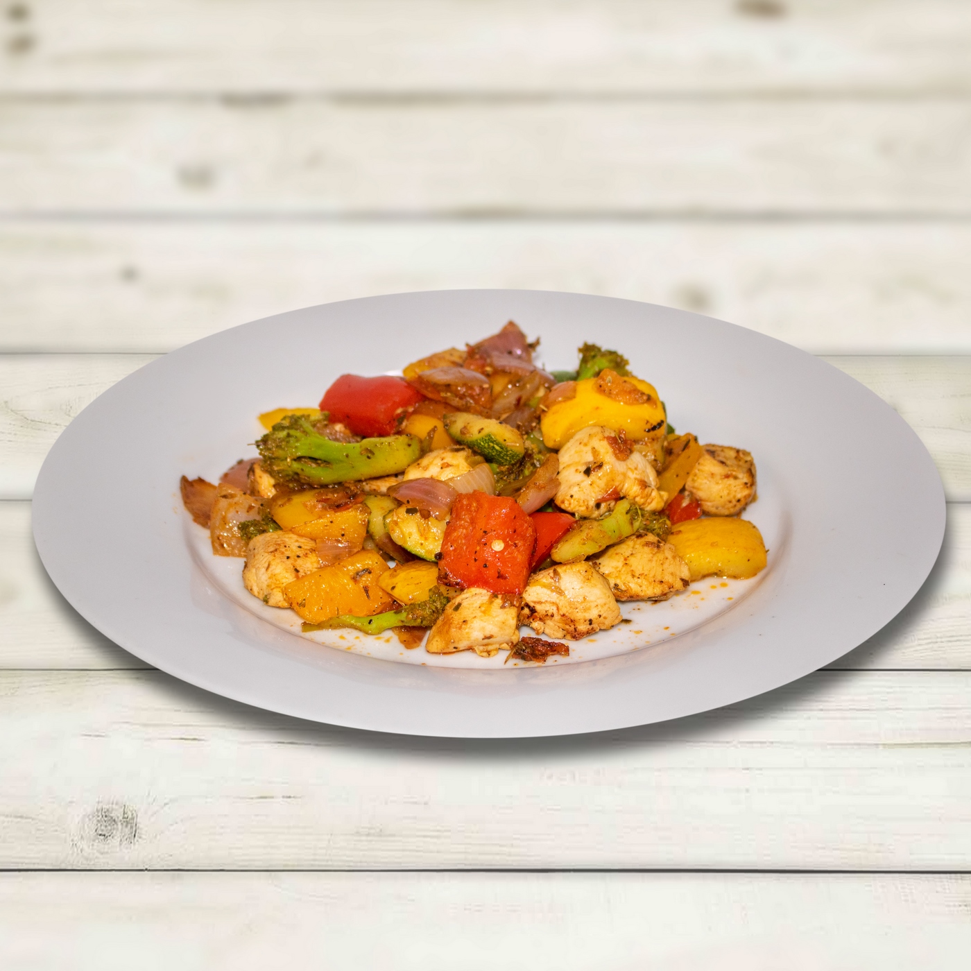 Chop all the veggies into large pieces. In another cutting board chop the chicken into cubes. Place the chicken and veggies in a medium roasting dish or sheet pan. Add the olive oil, salt, and pepper, Italian seasoning, and paprika. Toss to combine.