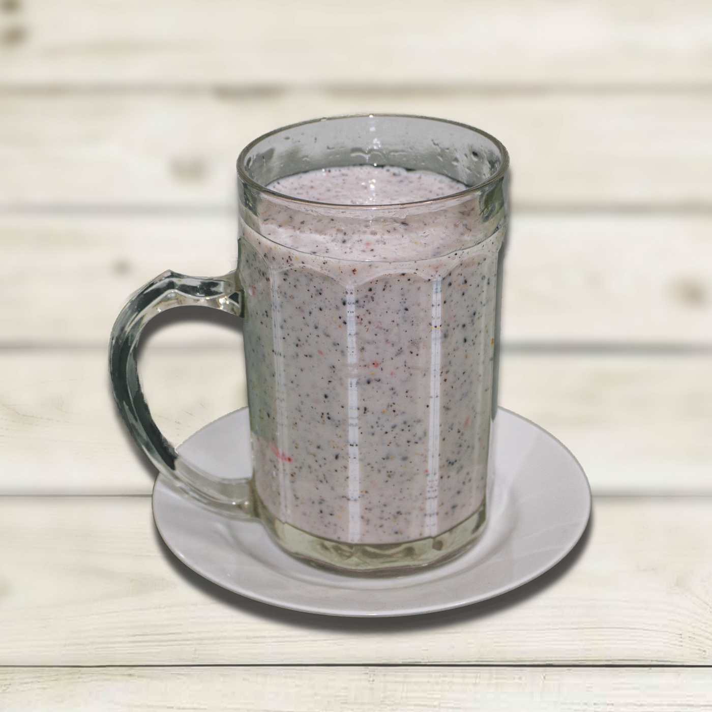 - Carefully pour the roasted strawberries and their juice into a blender along with cottage cheese, milk, ice and chia seeds, sugar free syrup and blend until smooth.