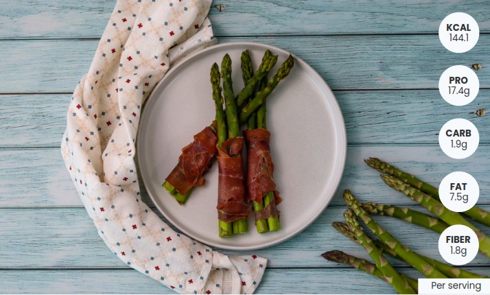Take the asparagus out, let it cool, and wrap two spears with one slice of serrano