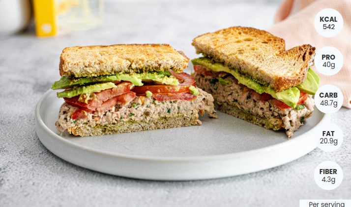 Scoop a hearty amount of the tuna mousse over the avocado and tomato. Spread