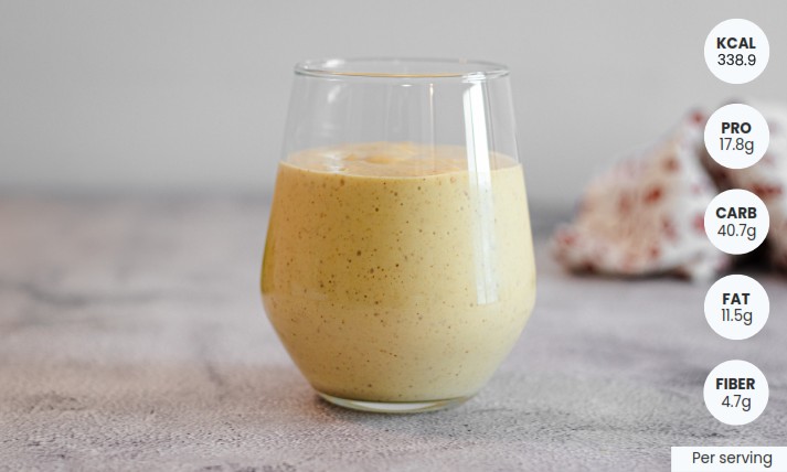 Start by adding the orange juice, greek yogurt, frozen mango, chopped banana,