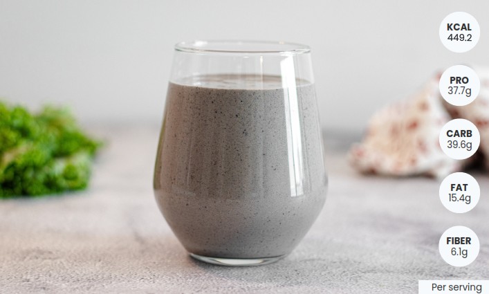 banana, blueberries, milk, protein powder, spinach, kale, cinnamon, and almond
