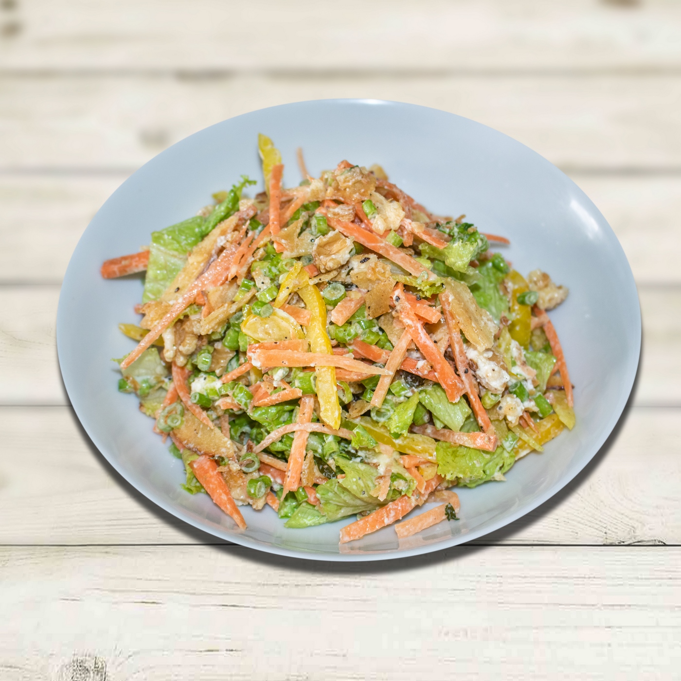 - Shred the carrot, romaine lettuce, bell pepper, and tomatoes, and thinly chop/slice green onion. Combine with the sliced apple, crushed tortilla chips, and grated cheese. Toss to combine.