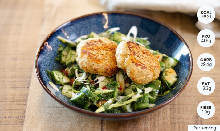 While the cakes chill, toss the cucumber, 2 spring onion, mint, coriander, lime juice,