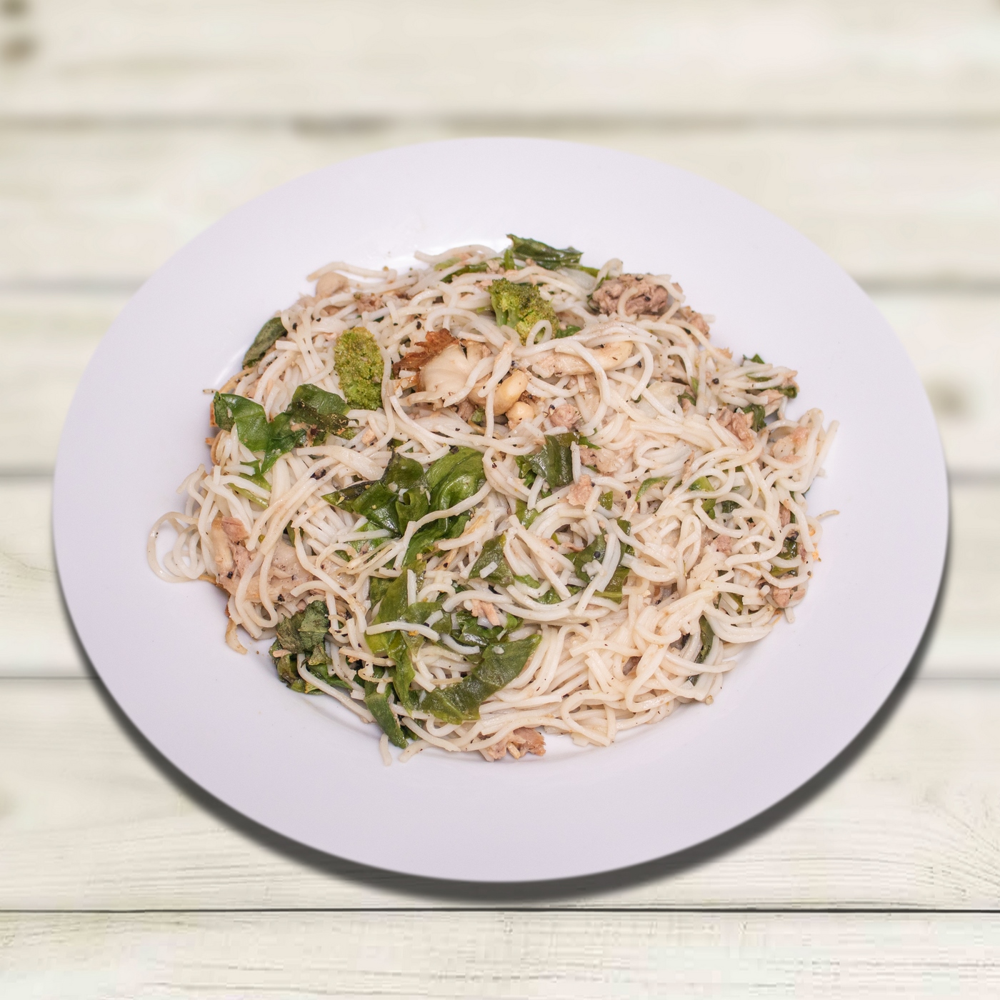 - Empty the tuna into a large bowl. Add spinach, sweetcorn, broccoli, and mushrooms. Mix well with chopped garlic and oil.