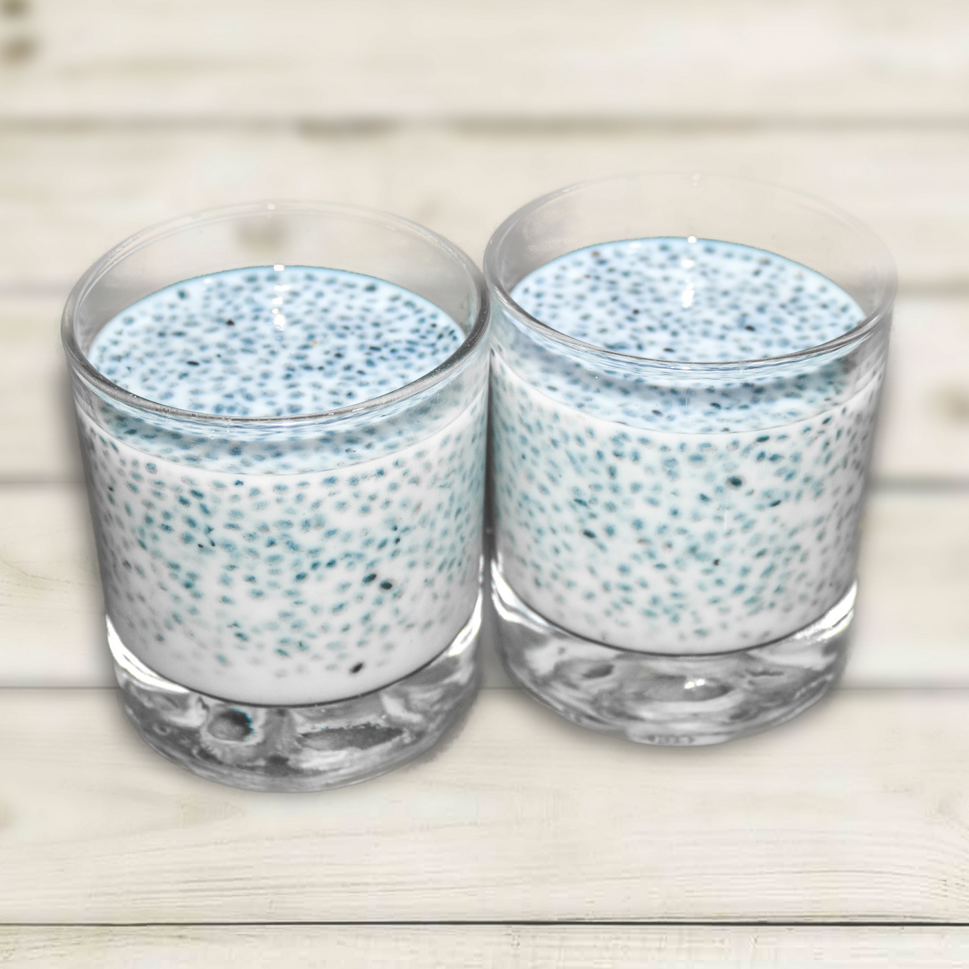 Whisk all ingredients together. Let sit overnight or refrigerate at least 4 hours. Adjust sweetener to taste. Top with blueberry, honey, banana.