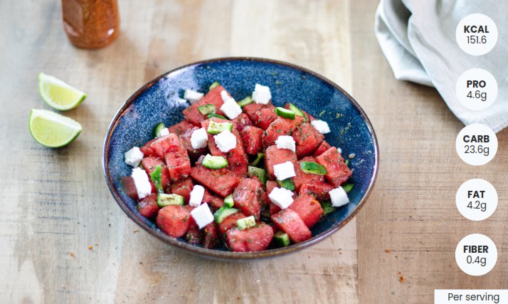 and dice it to match. In a bowl, combine the watermelon, cucumber, and