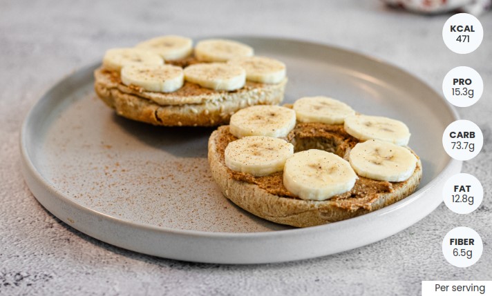 almond butter evenly on both halves of the warm bagel. Arrange the banana